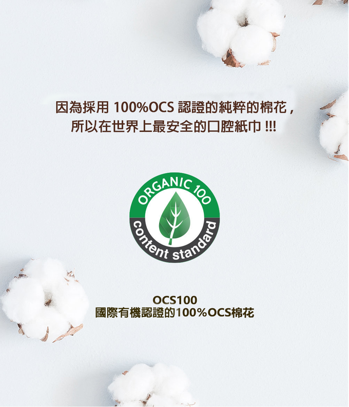 100%超純水、100%OCS認證純粹棉花