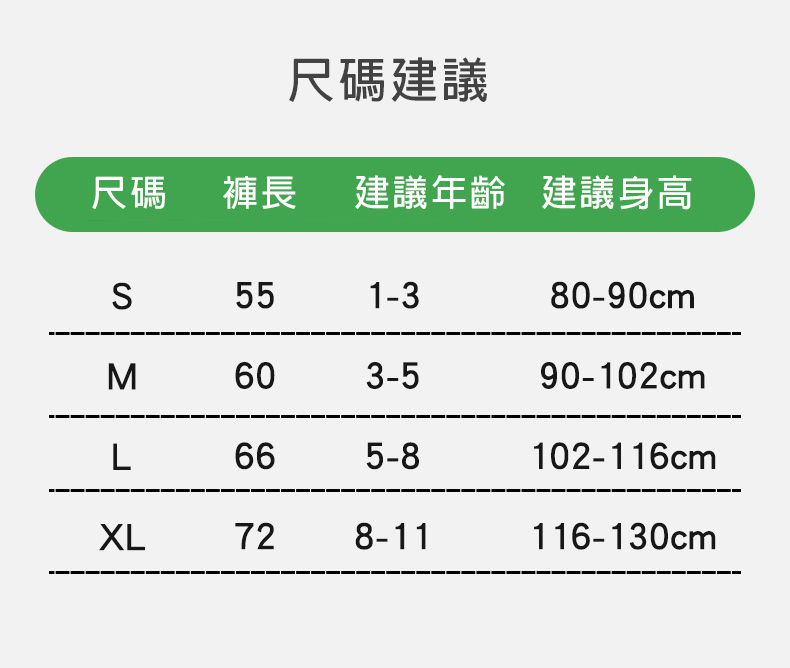 尺寸:M號(褲長60cm,建議身高90-102cm)、L號(褲長66cm,建議身高102-116cm)