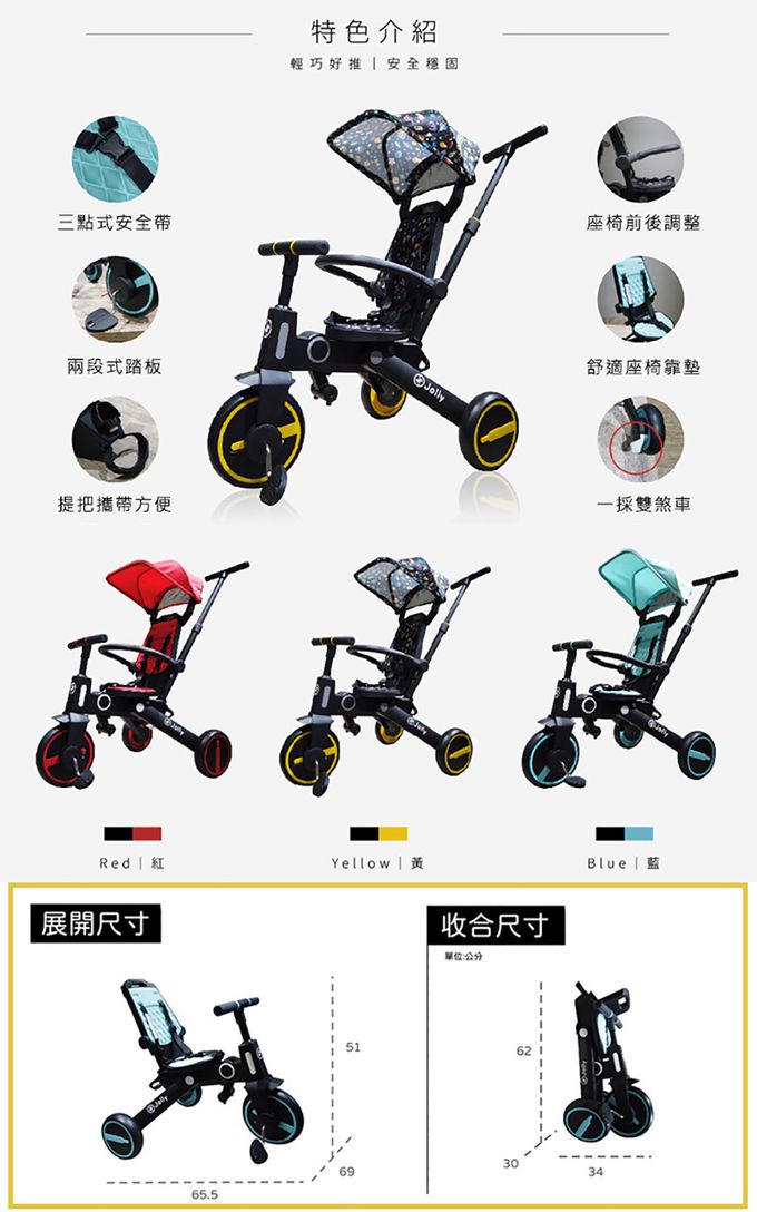 • 注意事項:材質: 鋁管、五金、塑膠 車重:約5.8公斤 適用年齡:18-60個月 最大承載重:15公斤 展開尺寸:約L51*W6g*H65.5cm 收合尺寸:約L39.5*W34*H62 cm 注意事項及警告 ◎請在成人的監護下使用本產品。 ◎請勿用自行車、汽車或其他車拖拉本產品。 ◎使用前請檢查所有連接位和螺絲,確保都有到位及鎖緊。 ◎使用時請穿戴安全帽、保護身體、鞋子等安全防護裝備。 ◎不允許任意修改和改裝,可能會減低產品的安全性造成危險。 ◎塑膠袋不是玩具,拆封時請丟棄和遠離幼童,避免發生危險。 ◎禁止於公共、一般道路、斜坡、水域等危險地方使用,請在空曠平坦安全的地方使用。