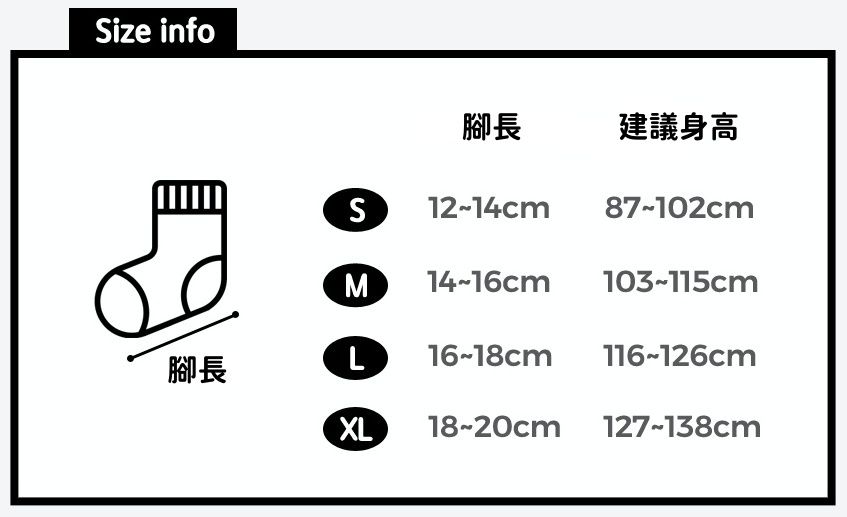 先來看一下各種襪子的大約長度,上排有左至右:船型襪、短襪、中筒襪;下排由左至右:半腿襪、長筒襪。