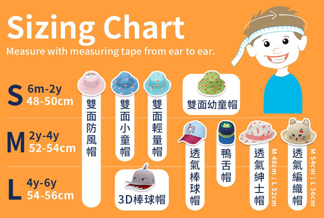 M(2y-4y)2歲~4歲:頭圍約52-54cm;繫帶約30.5cm-33.5cm