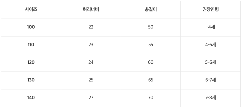 尺寸表由左至右為:尺寸、腰寬、褲長、建議年齡