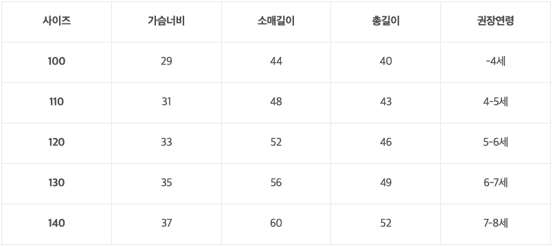 尺寸表由左至右為:尺寸、胸寬、袖長、衣長、建議年齡