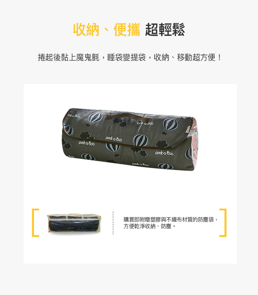 睡袋本身也有做提把哦!廠商有附一個防塵袋,但建議媽咪還是另外購買睡袋收納袋,比較耐用><