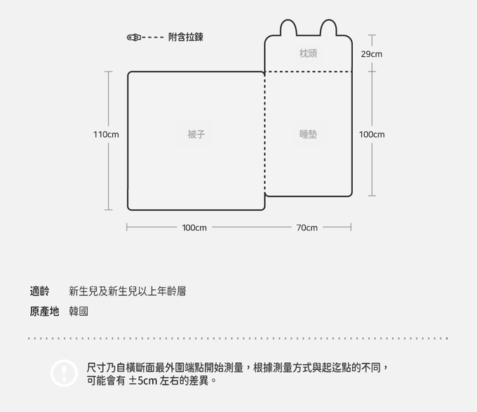 規格:枕頭 29x70 cm/睡墊 70x100 cm/棉被 100x110 cm