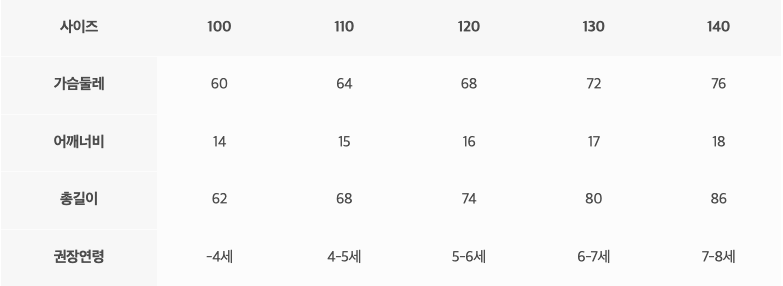 尺寸表由上而下為:尺寸、胸寬、肩寬、總長、建議年齡