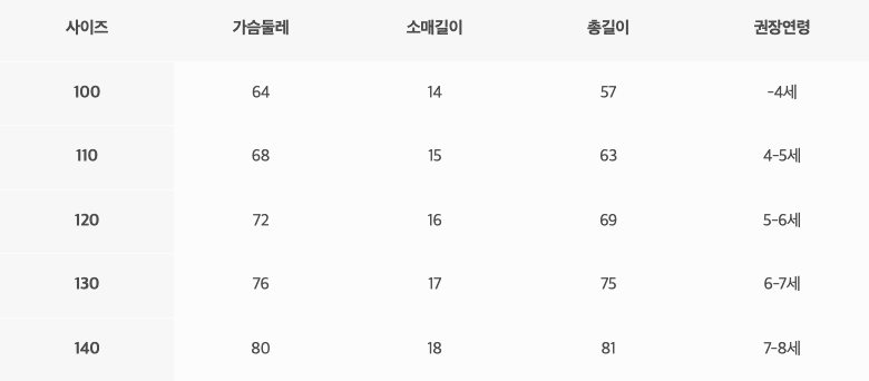 尺寸表由左至右為:尺寸、胸寬、袖長、總長、建議年齡