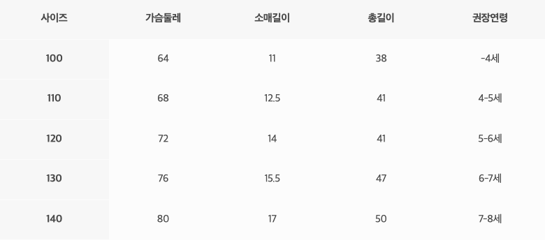 尺寸表由左至右為:尺寸、胸寬、袖長、總長、建議年齡
