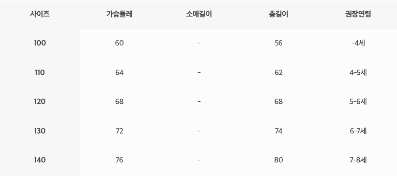 尺寸表由左至右為:尺寸、胸寬、肩寬、總長、建議年齡