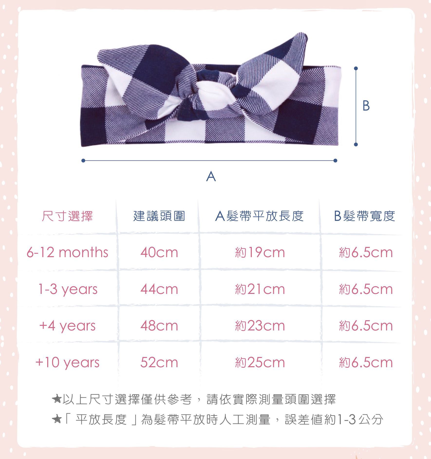 編媽一收到寬版髮帶時,真的有被他的質感嚇到!首先一摸他布料的觸感就已經覺得很棒了,非常的柔軟好摸。髮帶尺寸有 3-6 月、6-12 月、1-3 歲、+4歲,跟成人也能戴的 +10 歲,尺寸超多,頭再大也戴得下!