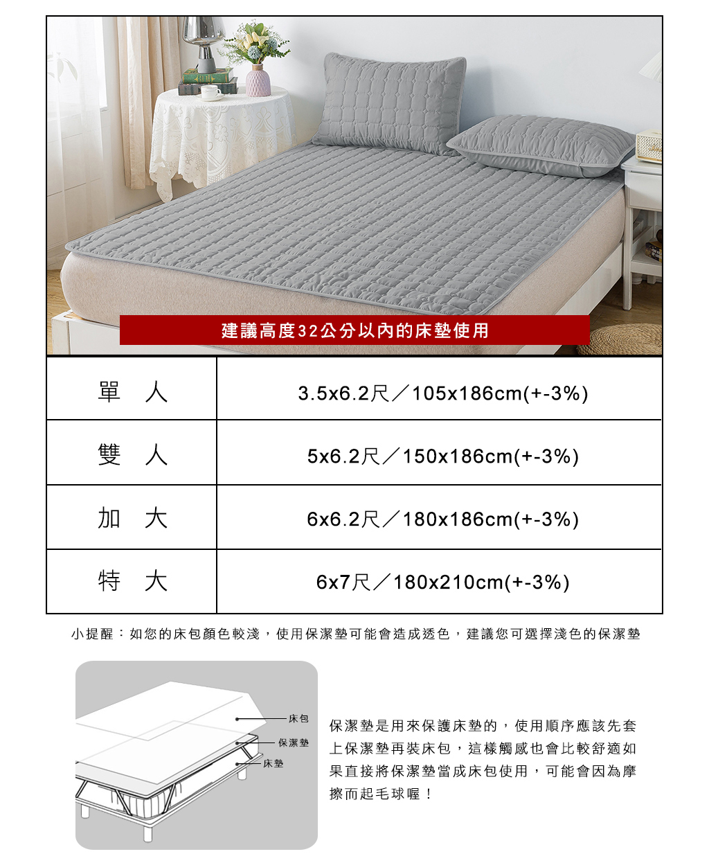 .尺寸:6x7尺(180x210公分)(±3%)可包覆床墊至32公分