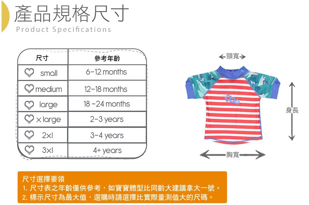 覺得分開的泳衣比較好穿脫,整套穿超可愛,建議上衣可以大一點,因為濕濕的比較好脫,我寶寶1y6m10.5kg頭圍47cm,帽XL/上衣2L/褲子XL 覺得剛剛好,不會太緊,褲子怕便便跑出來,所以選比較合身一些。給大家參考。