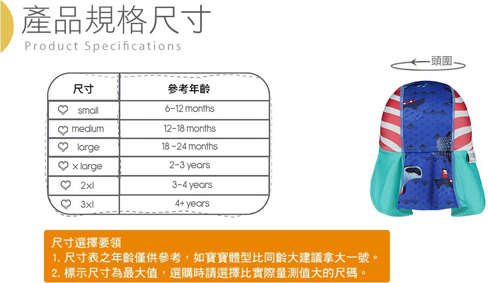 覺得分開的泳衣比較好穿脫,整套穿超可愛,建議上衣可以大一點,因為濕濕的比較好脫,我寶寶1y6m10.5kg頭圍47cm,帽XL/上衣2L/褲子XL 覺得剛剛好,不會太緊,褲子怕便便跑出來,所以選比較合身一些。給大家參考。