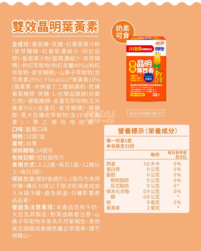 葡萄糖、乳糖、紅葡萄果汁粉(麥芽糊精、紅葡萄濃縮汁、阿拉伯膠)、藍莓果汁粉(藍莓濃縮汁、麥芽糊精)、枸杞萃取物(枸杞多醣40%)(枸杞萃取物、麥芽糊精)、山桑子萃取物(含花青素25%)、FloraGLO® 葉黃素10%(葉黃素、辛烯基丁二酸鈉澱粉、乾燥葡萄糖漿、蔗糖、L-抗壞血酸鈉(抗氧化劑))、硬脂酸鎂、金盞花萃取物(玉米黃素5%)(金盞花、麥芽糊精)、檸檬酸、黑大豆種皮萃取物(含10%花青素)、聚乙烯吡咯烷酮