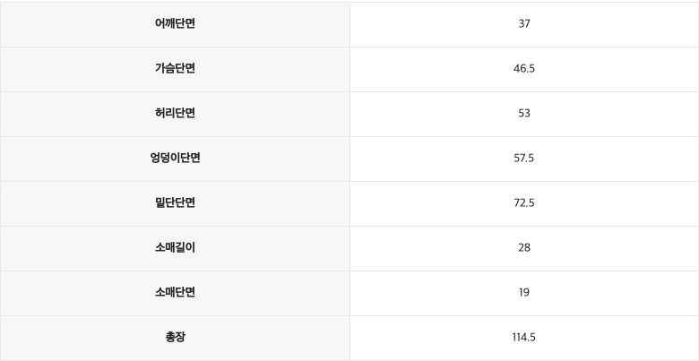 尺寸表由上而下為:肩寬、胸寬、腰寬、臀寬、下擺寬、袖長、袖口寬、總長