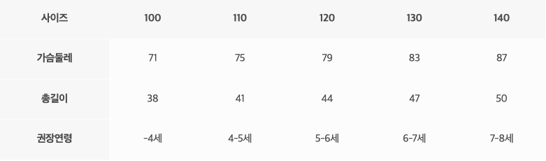 尺寸表由上而下為:尺寸、胸圍、總長、建議年齡