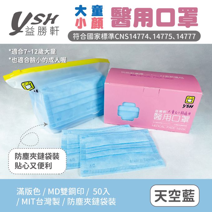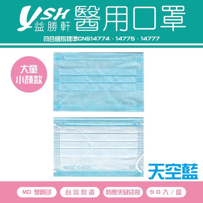 YSH 益勝軒 - 大童醫療級三層平面口罩/滿版/雙鋼印/台灣製-天空藍 (14.5x9.5cm)-50入/盒(未滅菌)