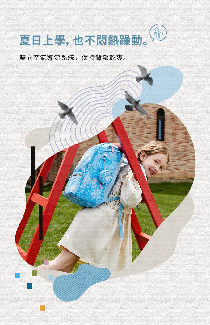 書包底部有耐磨腳墊,孩子隨意放置於地上也不會刮壞底部。背帶有透氣孔設計,夏天背也不悶熱!可以看到書包背板是一體成型的,背後也有設計上的小巧思可以寫上孩子的姓名,同時又帶有隱私性!
