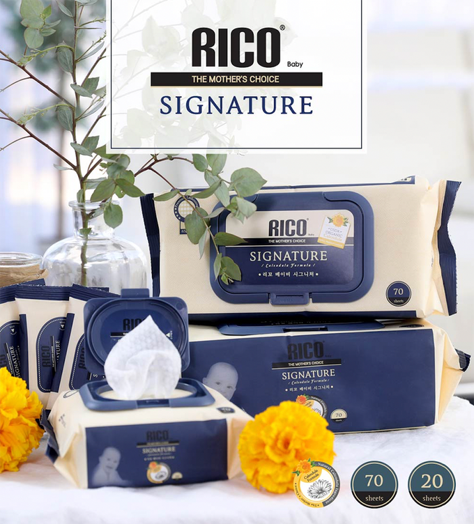 韓國RICO baby - 金盞花有機天然特厚款濕紙巾Signature 70抽-(12+2包Signature有蓋20抽紙巾 組/箱)
