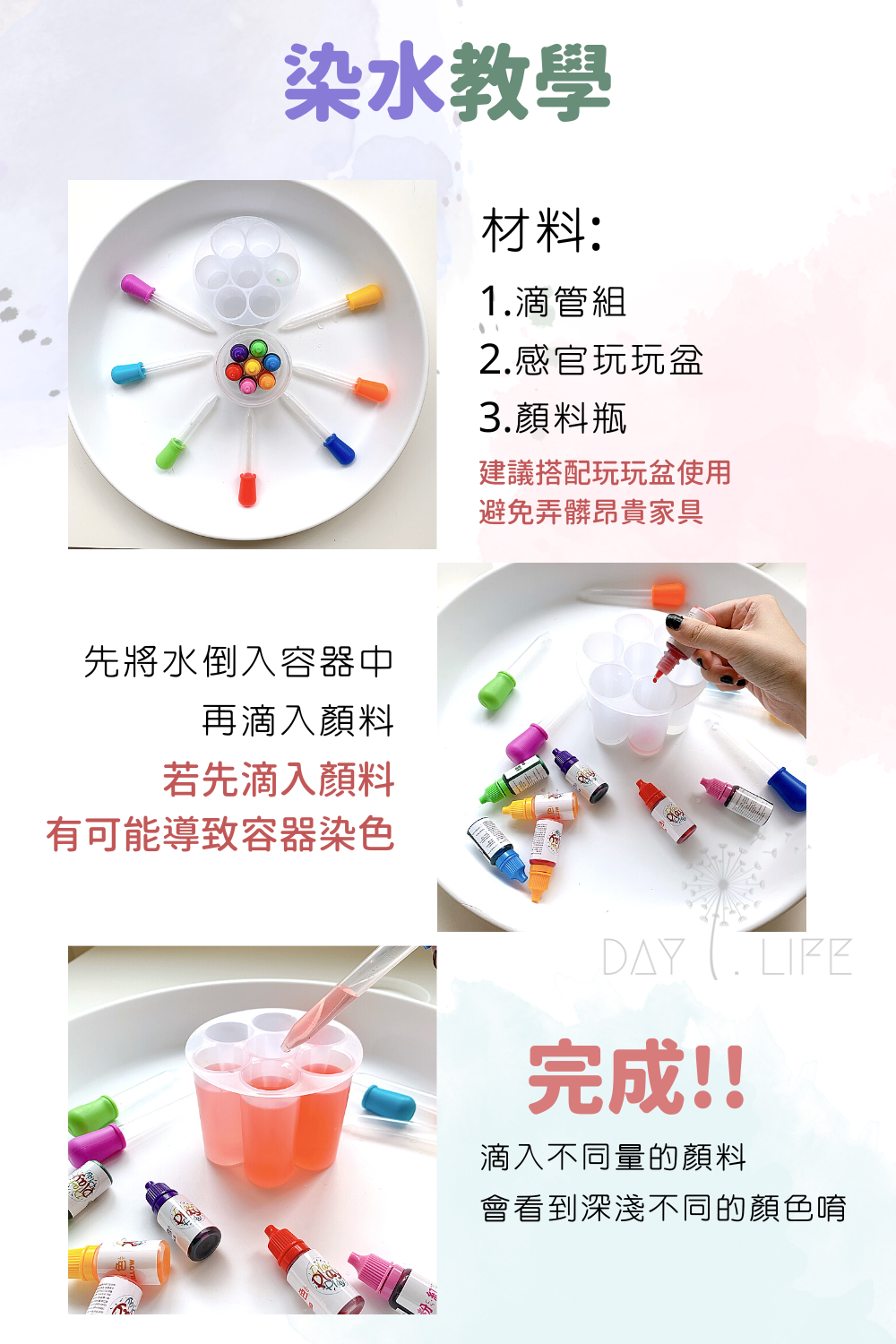 讓小孩體驗不同的顏色作畫,搭配滴管讓小孩玩色彩
