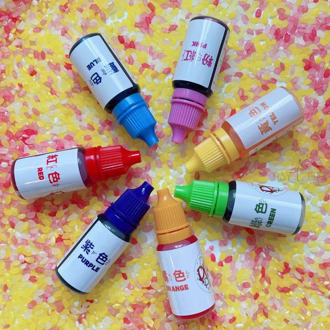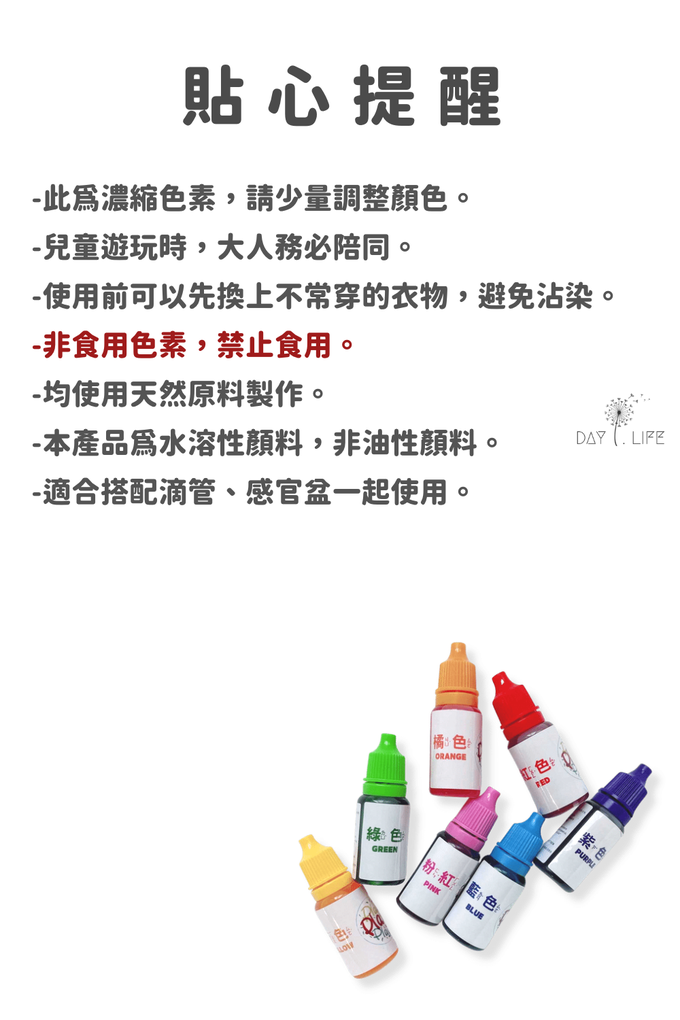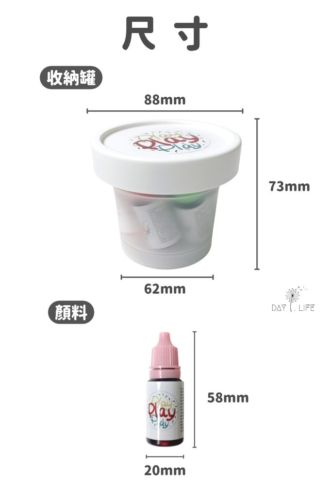 內容物:色素顏料瓶7瓶(紅色、橘色、黃色、綠色、藍色、紫色、粉紅)+收納圓罐