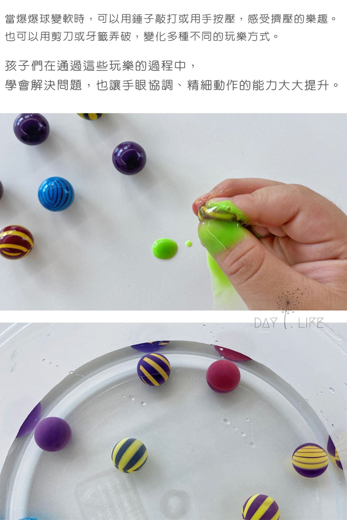 使用方式:1.將彩彈球放置在容器中 2.球與球之間保持距離避免沾黏 3.倒入35~38度的溫水浸泡1分鐘 4.等待表面軟化後就能使用