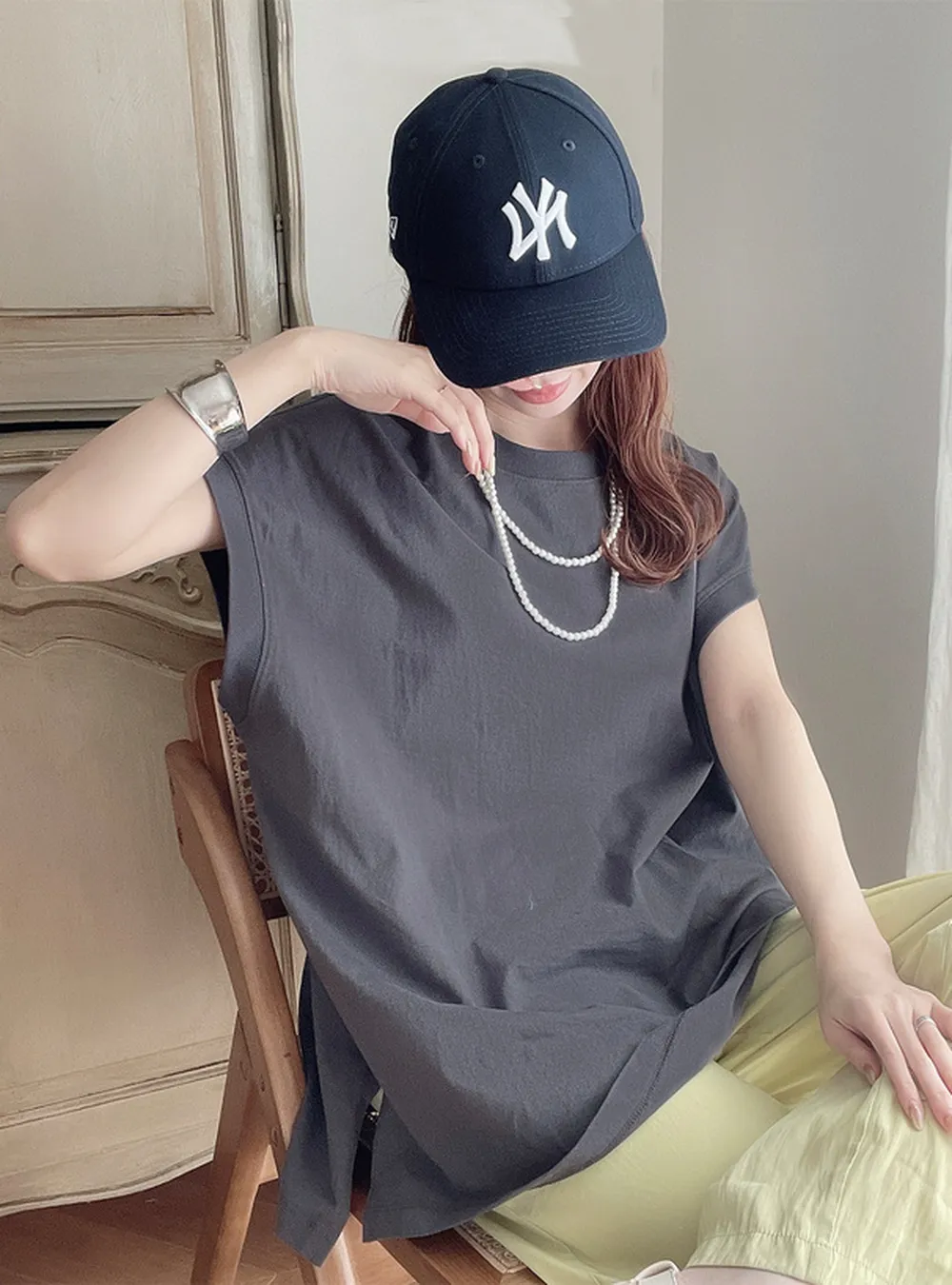 ![日本 GRL - 優雅抓皺泡泡布吊帶裙-米杏]()