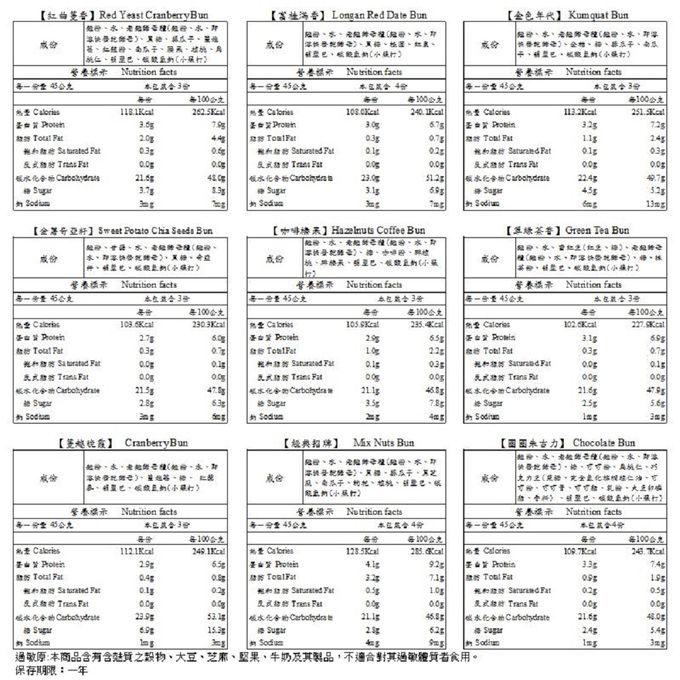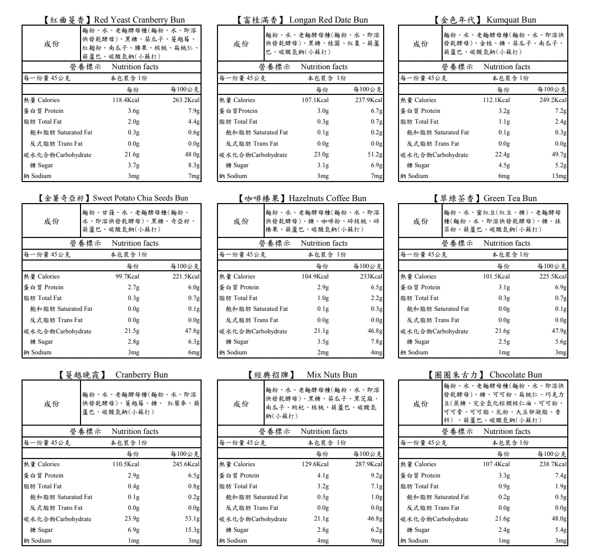 翠綠茶香 : 麵粉、水、蜜紅豆(紅豆、糖)、老麵酵母種(麵粉、水、即溶快發乾酵母)、糖、抹茶粉、葫蘆巴、碳酸氫鈉(小蘇打)