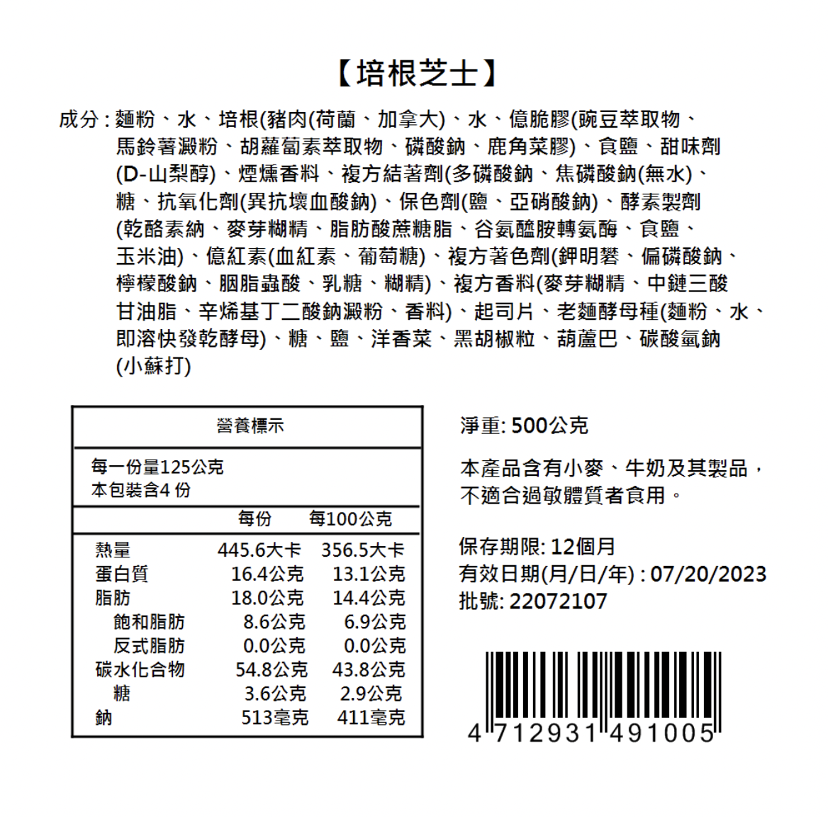 成分:麵粉、水、培根(豬肉(荷蘭)、水、億脆膠(豌豆萃取物、馬鈴薯澱粉、胡蘿蔔素萃取物、磷酸鈉、鹿角菜膠)、食鹽、甜味劑(D-山梨醇)、煙燻香料、複方結著劑(多磷酸鈉、焦磷酸鈉(無水)、糖、抗氧化劑(異抗壞血酸鈉)、保色劑(鹽、亞硝酸鈉)、酵素製劑(乾酪素納、麥芽糊精、脂肪酸蔗糖脂、谷氨醯胺轉氨酶、食鹽、玉米油)、億紅素(血紅素、葡萄糖)、複方著色劑(鉀明礬、偏磷酸鈉、檸檬酸鈉、胭脂蟲酸、乳糖、糊精)、複方香料(麥芽糊精、中鏈三酸甘油脂、辛烯基丁二酸鈉澱粉、香料)、起司片、老麵酵母種(麵粉、水、即溶快發乾酵母)、糖、鹽、洋香菜、黑胡椒粒、葫蘆巴、碳酸氫鈉(小蘇打)
