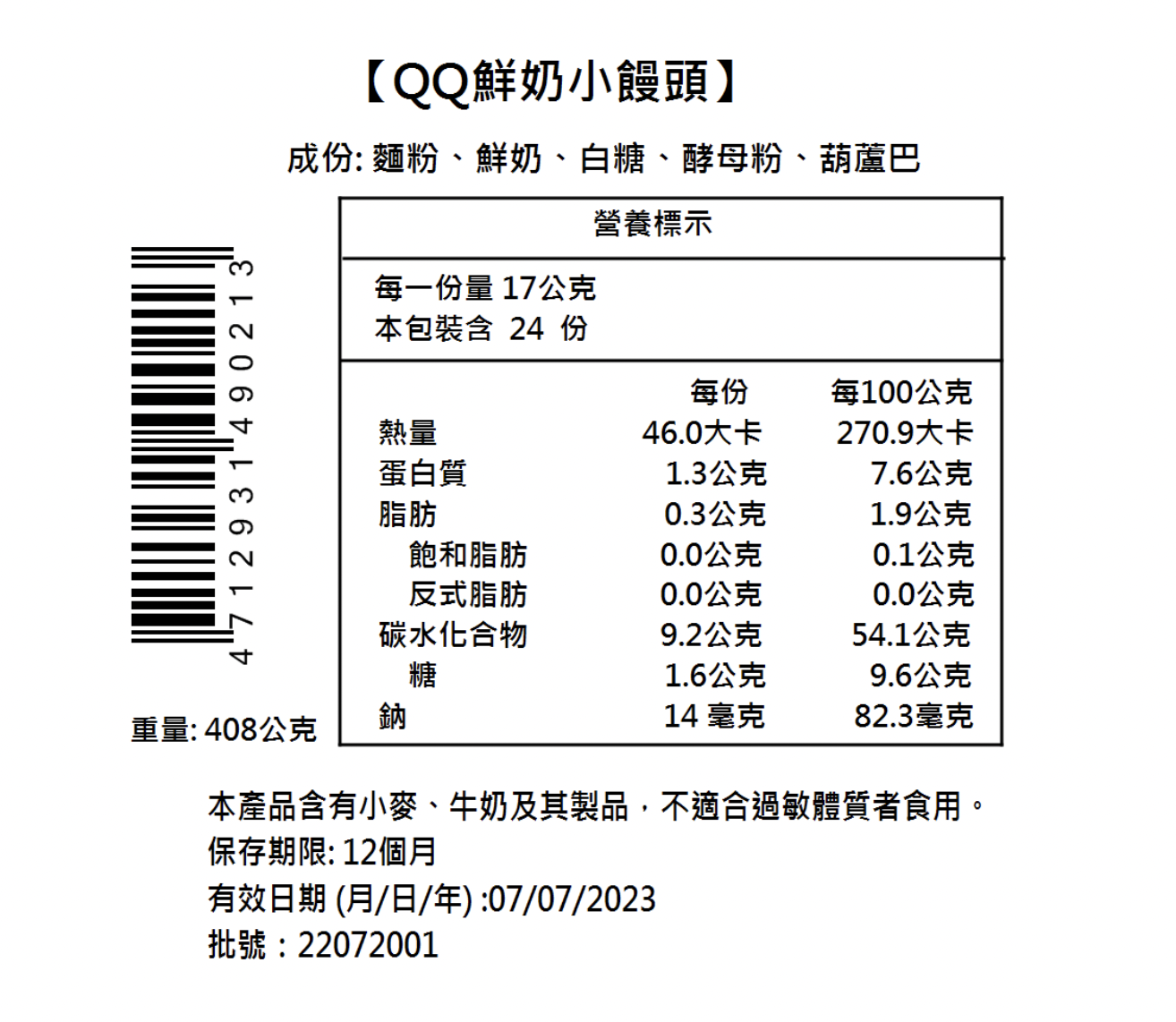 過敏原:本產品含有含麩質之穀物、鮮奶及其製品、不適合過敏體質者食用