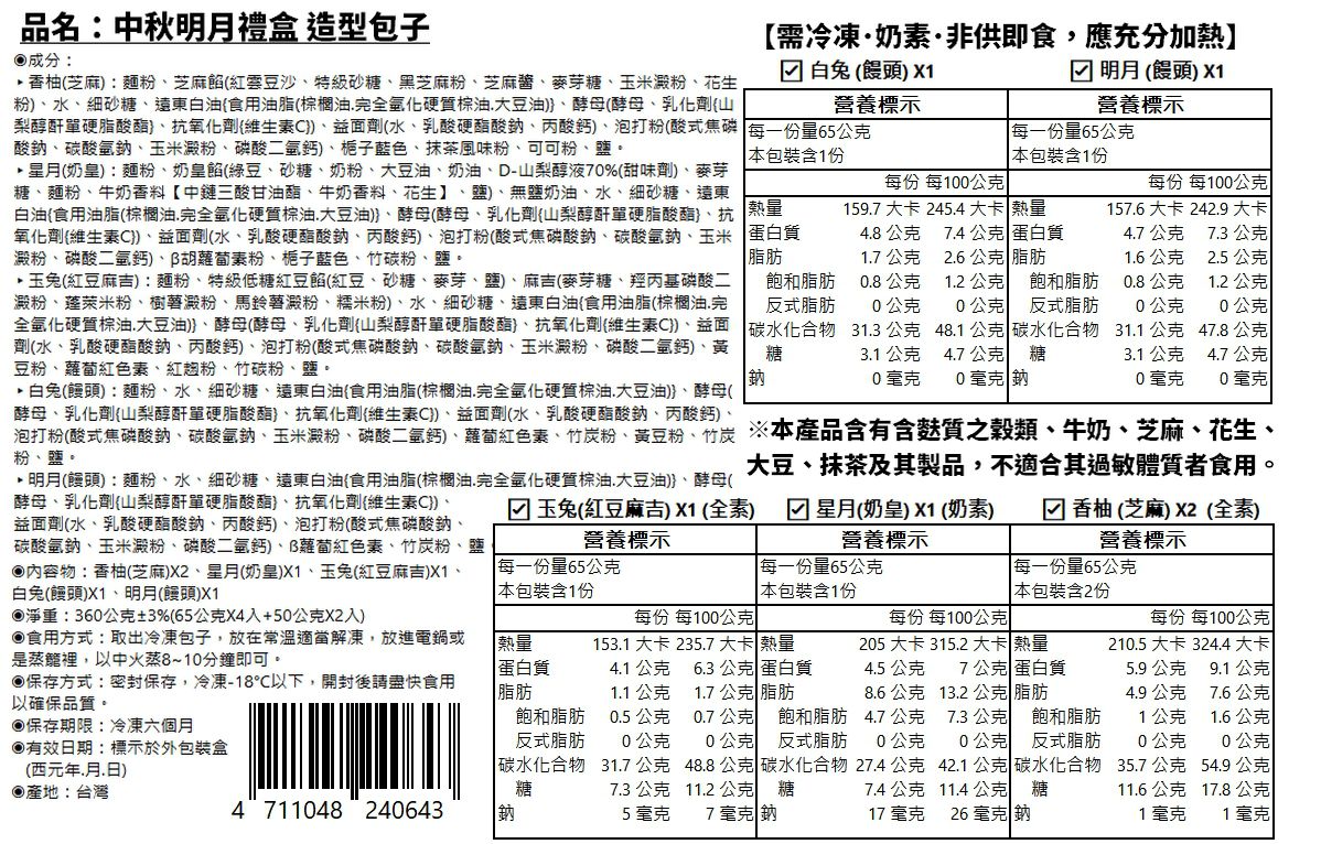 • 成分:▸香柚(芝麻):麵粉、芝麻餡、水、黑芝麻粉、細砂糖、水、無鹽奶油、細砂糖、日式抹茶粉、酵母(酵母、乳化劑{山梨醇酐單硬脂酸酯}、抗氧化劑{維生素C})、泡打粉(酸式焦磷酸鈉、碳酸氫鈉、玉米澱粉、磷酸二氫鈣)、益面劑(水、乳酸硬酯酸鈉、丙酸鈣)、植物油、梔子藍色、抹茶風味粉、可可粉、鹽 ▸星月(奶皇):麵粉、奶皇餡(綠豆、砂糖、奶粉、大豆油、奶油、D-山梨醇液70%(甜味劑)、麥芽糖、麵粉、牛奶香料【中鏈三酸甘油酯、牛奶香料、花生】、鹽)、水、無鹽奶油、細砂糖、酵母(酵母、乳化劑{山梨醇酐單硬脂酸酯}、抗氧化劑{維生素C})、植物油(棕櫚油、椰子油)、益面劑(水、乳酸硬酯酸鈉、丙酸鈣)、泡打粉(酸式焦磷酸鈉、碳酸氫鈉、玉米澱粉、磷酸二氫鈣)、β胡蘿蔔素粉、竹碳粉、梔子藍色、鹽 ▸玉兔(紅豆麻吉):麵粉、特級低糖紅豆餡(紅豆、砂糖、麥芽、鹽)、原味麻吉、水、細砂糖、酵母(酵母、乳化劑{山梨醇酐單硬脂酸酯}、抗氧化劑{維生素C})、植物油(棕櫚油、椰子油)、泡打粉(酸式焦磷酸鈉、碳酸氫鈉、玉米澱粉、磷酸二氫鈣)、益面劑(水、乳酸硬酯酸鈉、丙酸鈣)、蘿蔔紅色素、竹碳粉、紅趜粉、鹽 ▸白兔(饅頭):麵粉、水、細砂糖、植物油、酵母(酵母、乳化劑{山梨醇酐單硬脂酸酯}、抗氧化劑{維生素C})、益面劑(水、乳酸硬酯酸鈉、丙酸鈣)、泡打粉(酸式焦磷酸鈉、碳酸氫鈉、玉米澱粉、磷酸二氫鈣)、蘿蔔紅色素、竹炭粉、黃豆粉、鹽 ▸明月(饅頭):麵粉、水、細砂糖、植物油、酵母(酵母、乳化劑{山梨醇酐單硬脂酸酯}、抗氧化劑{維生素C})、益面劑(水、乳酸硬酯酸鈉、丙酸鈣)、泡打粉(酸式焦磷酸鈉、碳酸氫鈉、玉米澱粉、磷酸二氫鈣)、ß蘿蔔紅色素、竹炭粉、黃豆粉、鹽