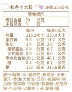 成分:水餃皮成份:麵粉、水、鹽、紅麴粉、南瓜粉、菠菜粉、竹碳粉、紫薯粉、黑芝麻粉、全麥粉、火龍果汁、紅蘿蔔、蝶豆花。內餡成份:豬絞肉、高麗菜、香油、薑汁