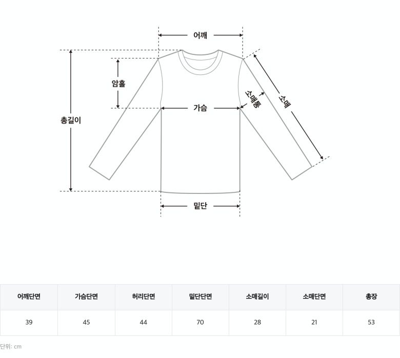 尺寸表由左至右為:肩寬、胸寬、腰寬、臀寬、下擺寬、袖長、袖口寬、總長