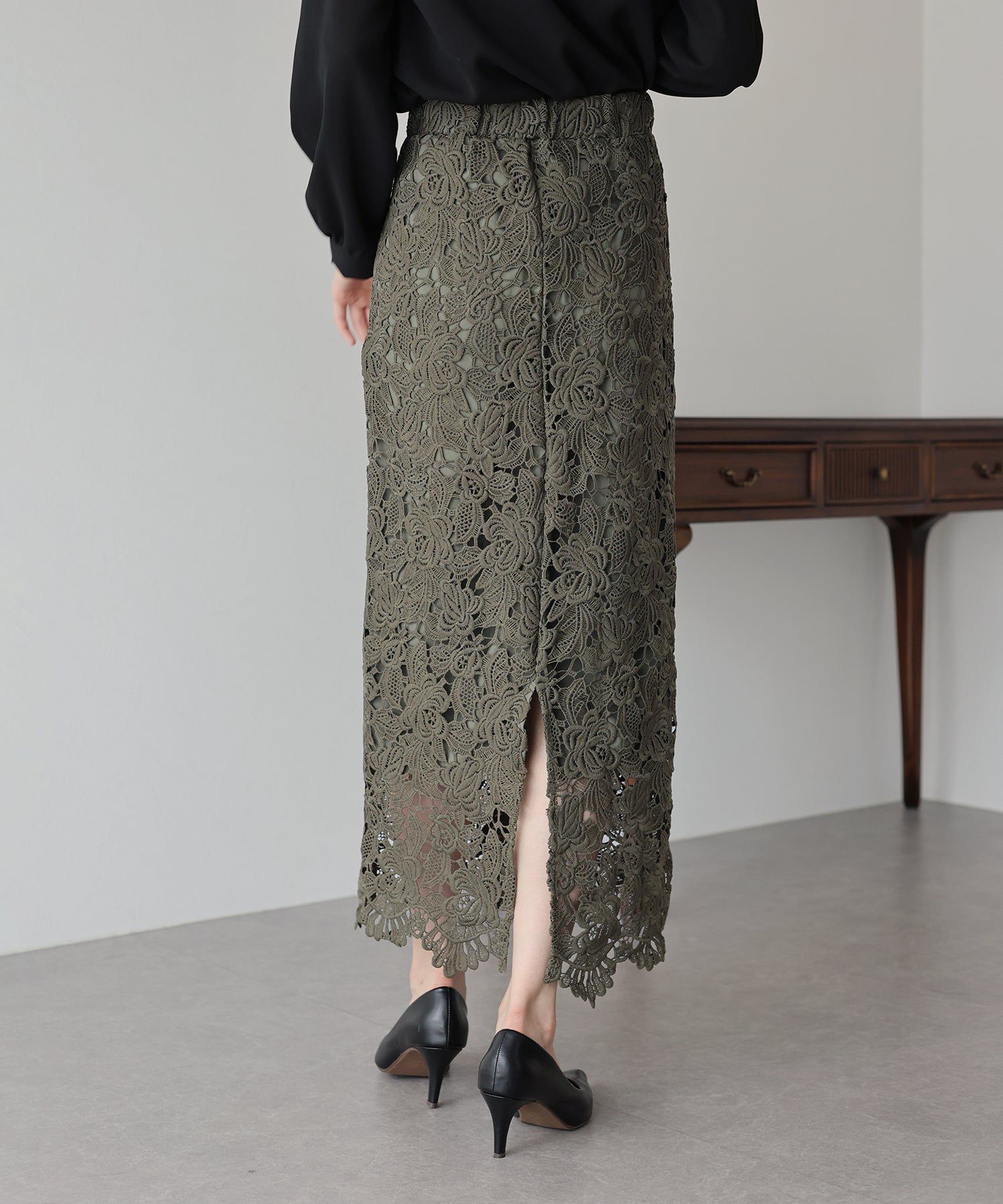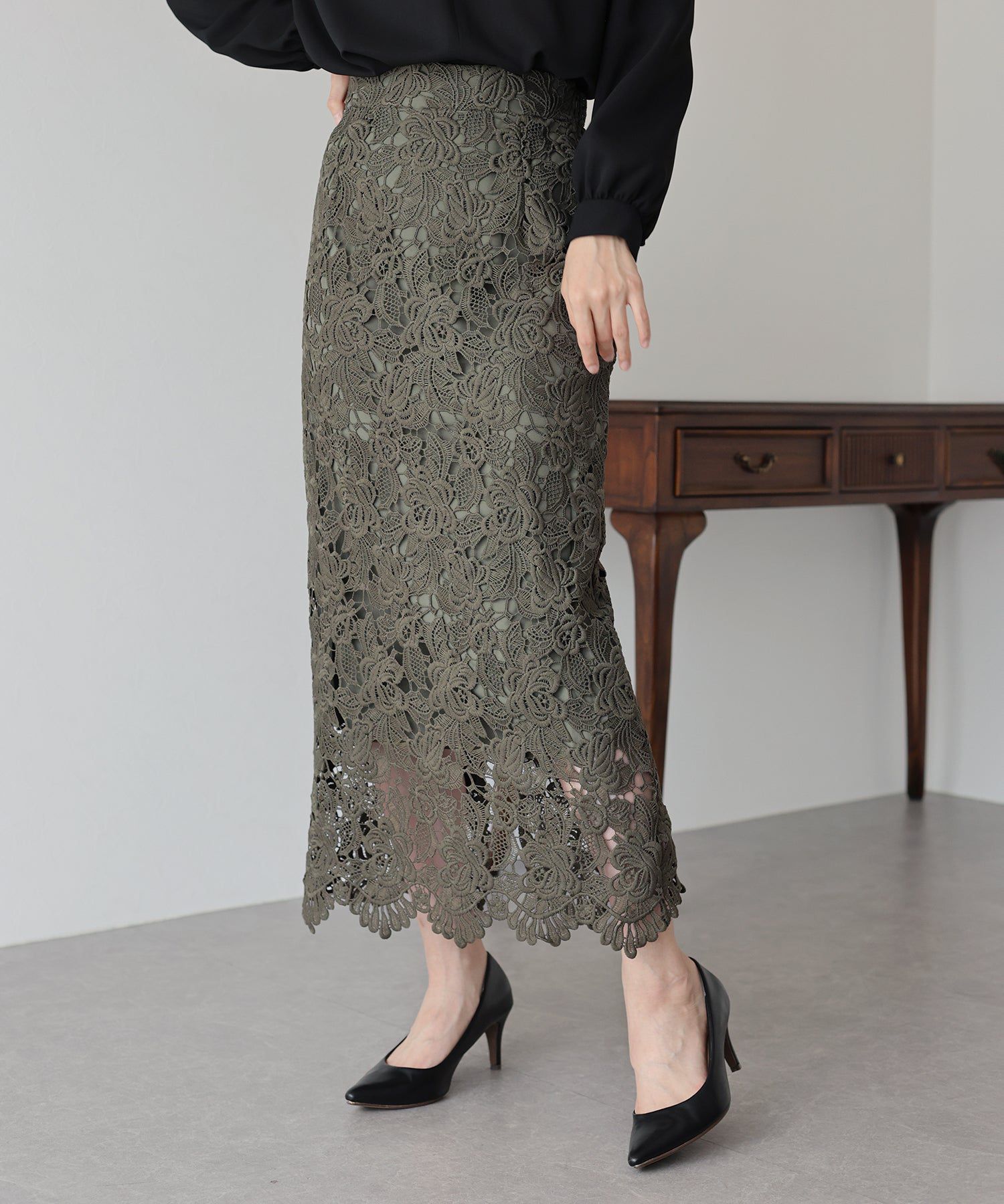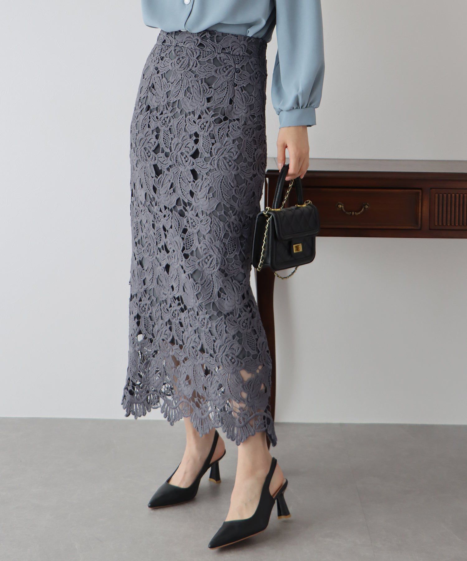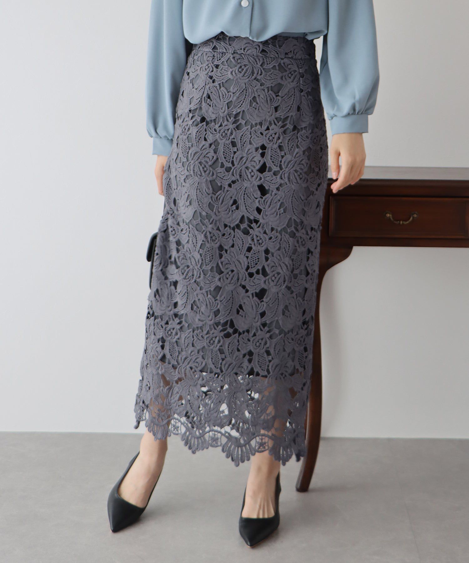 日本 BLUE EAST - 高雅蕾絲雕花鉛筆窄裙-灰黑