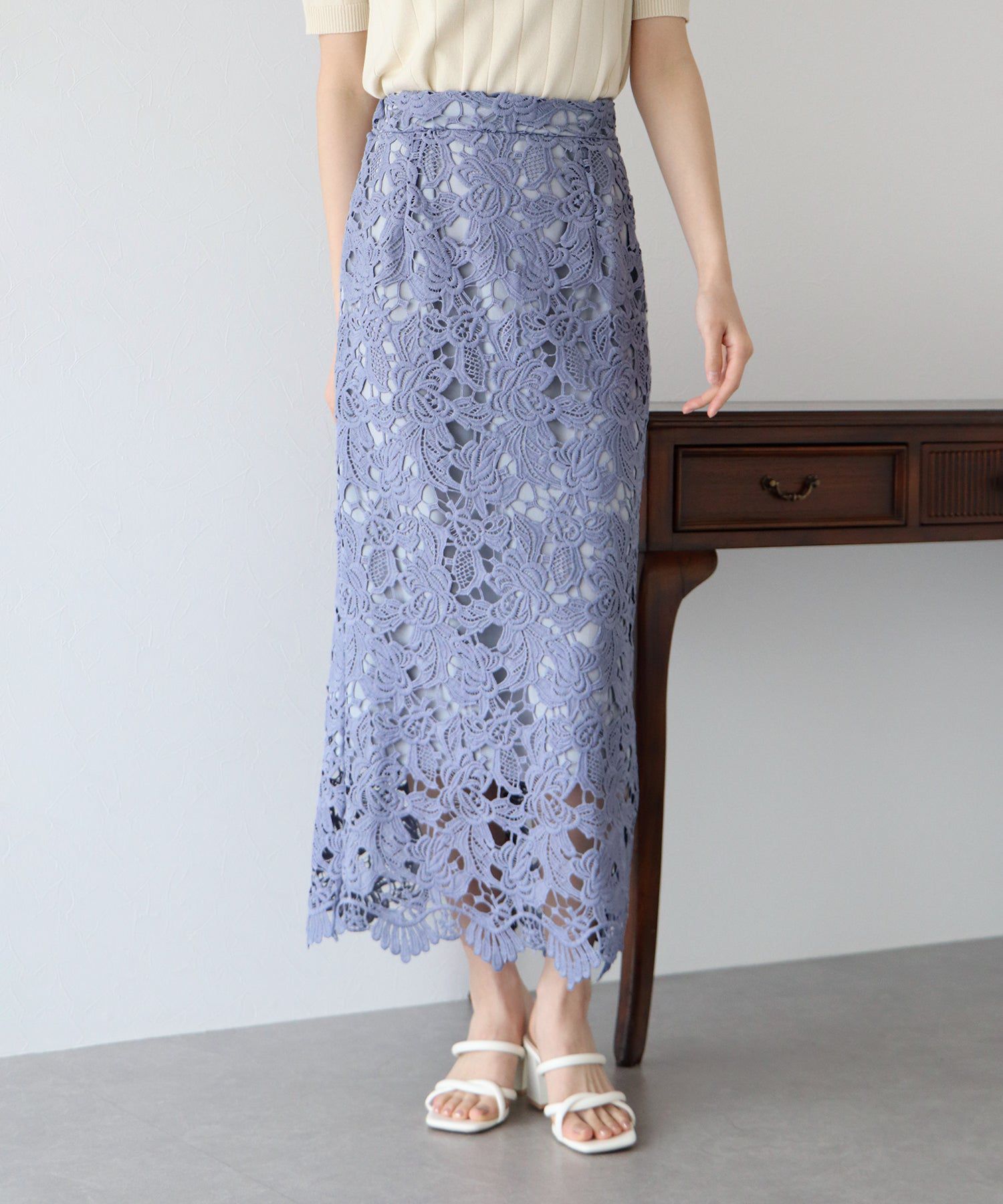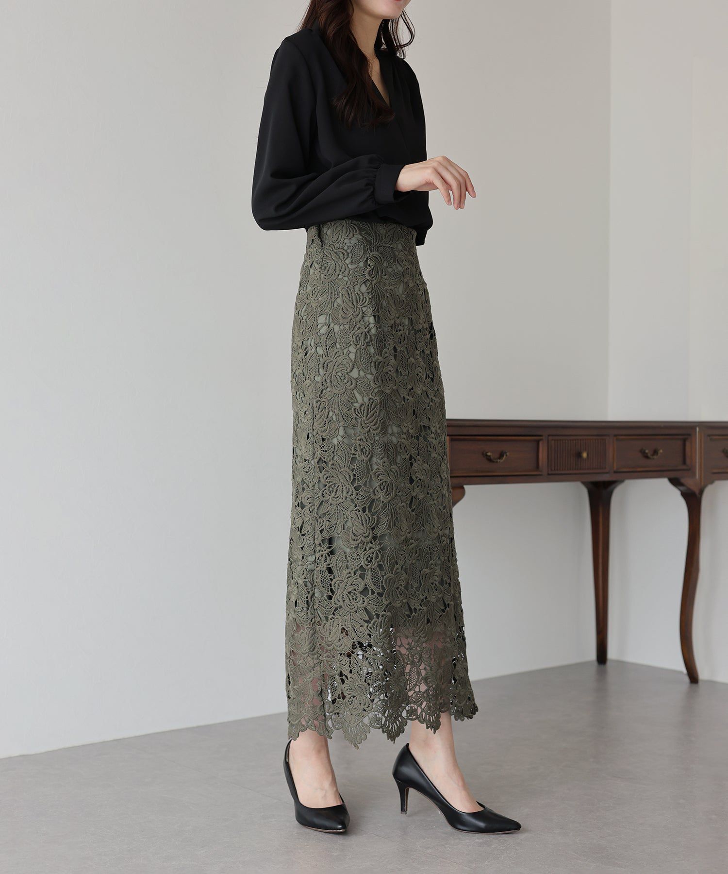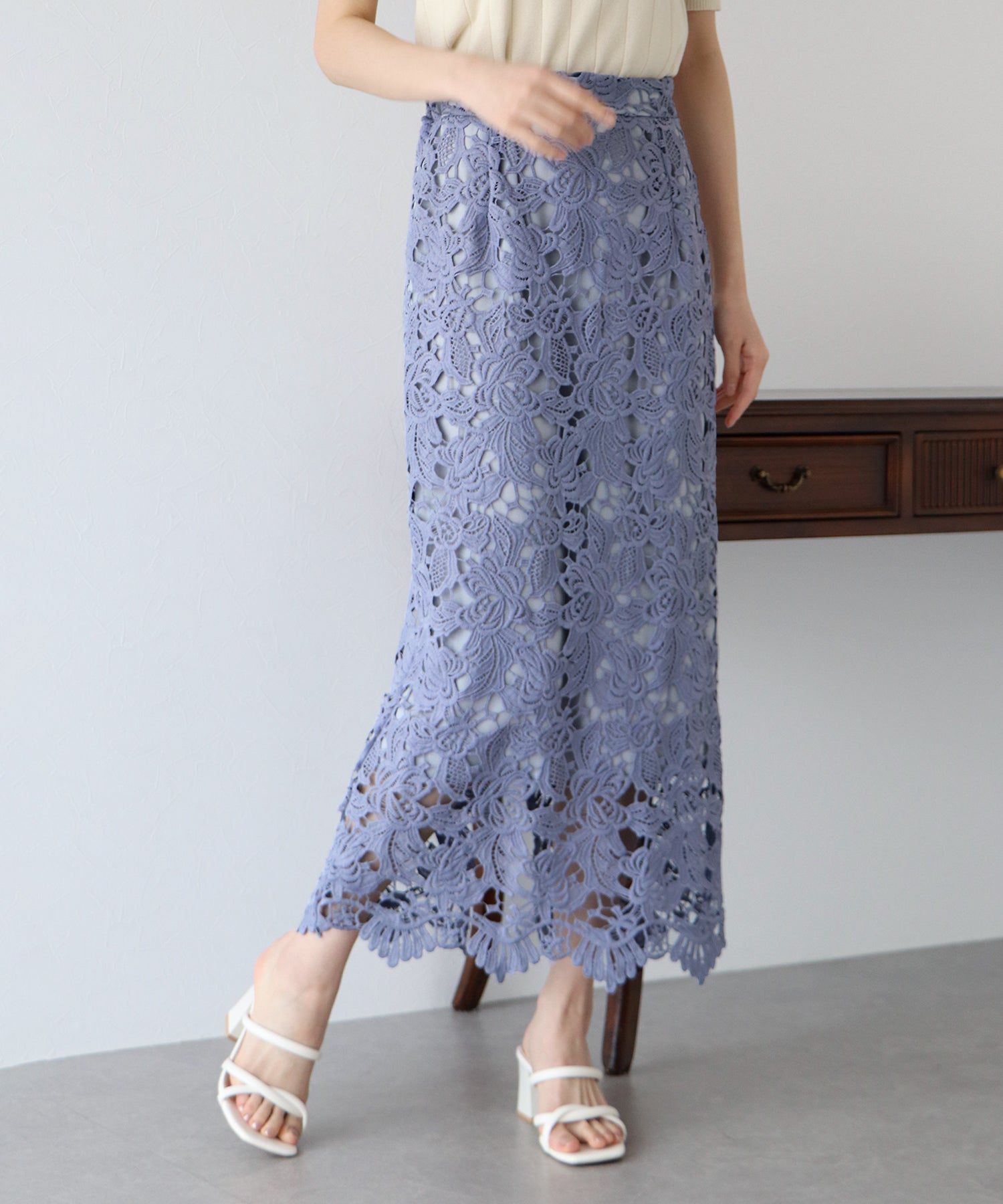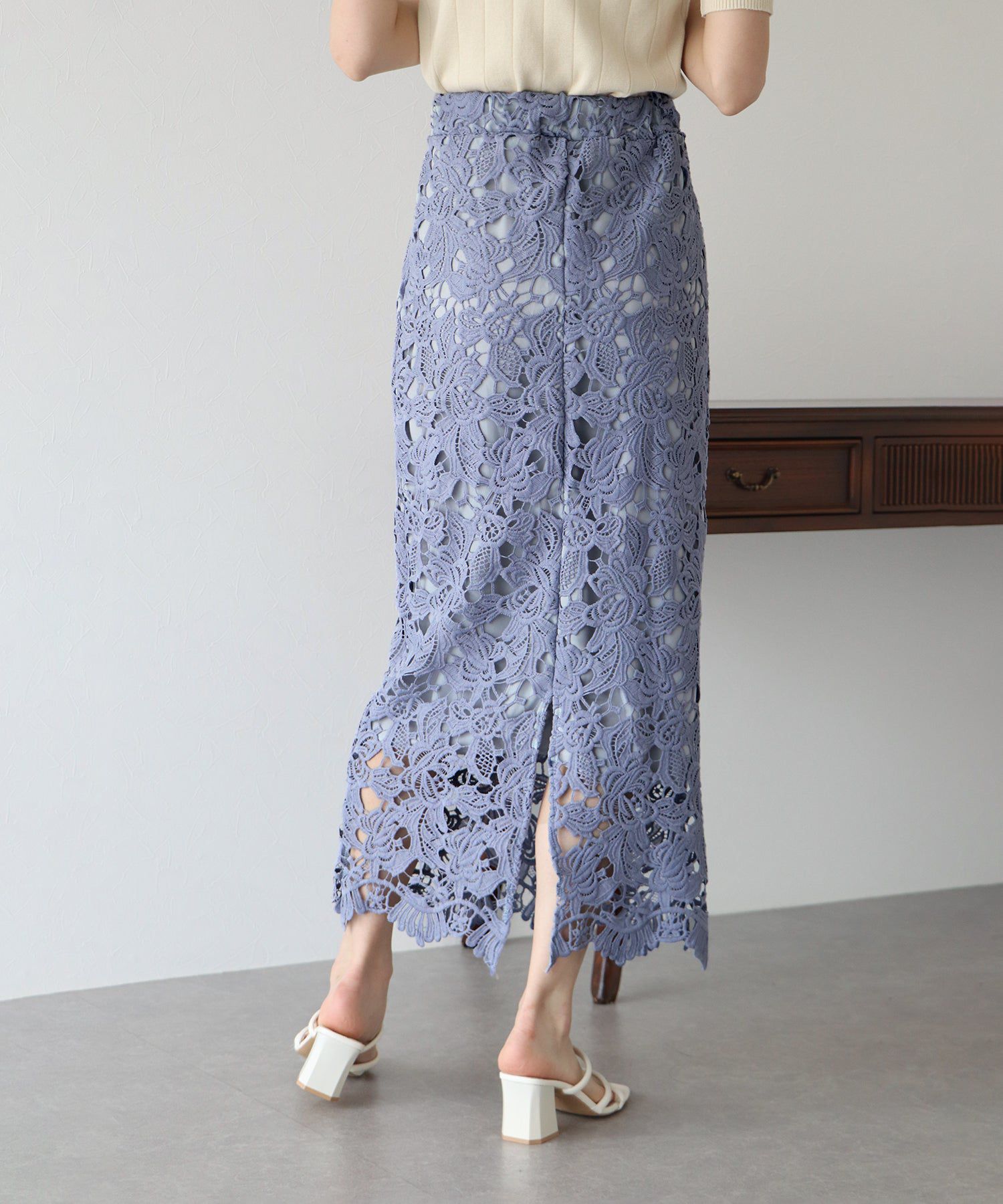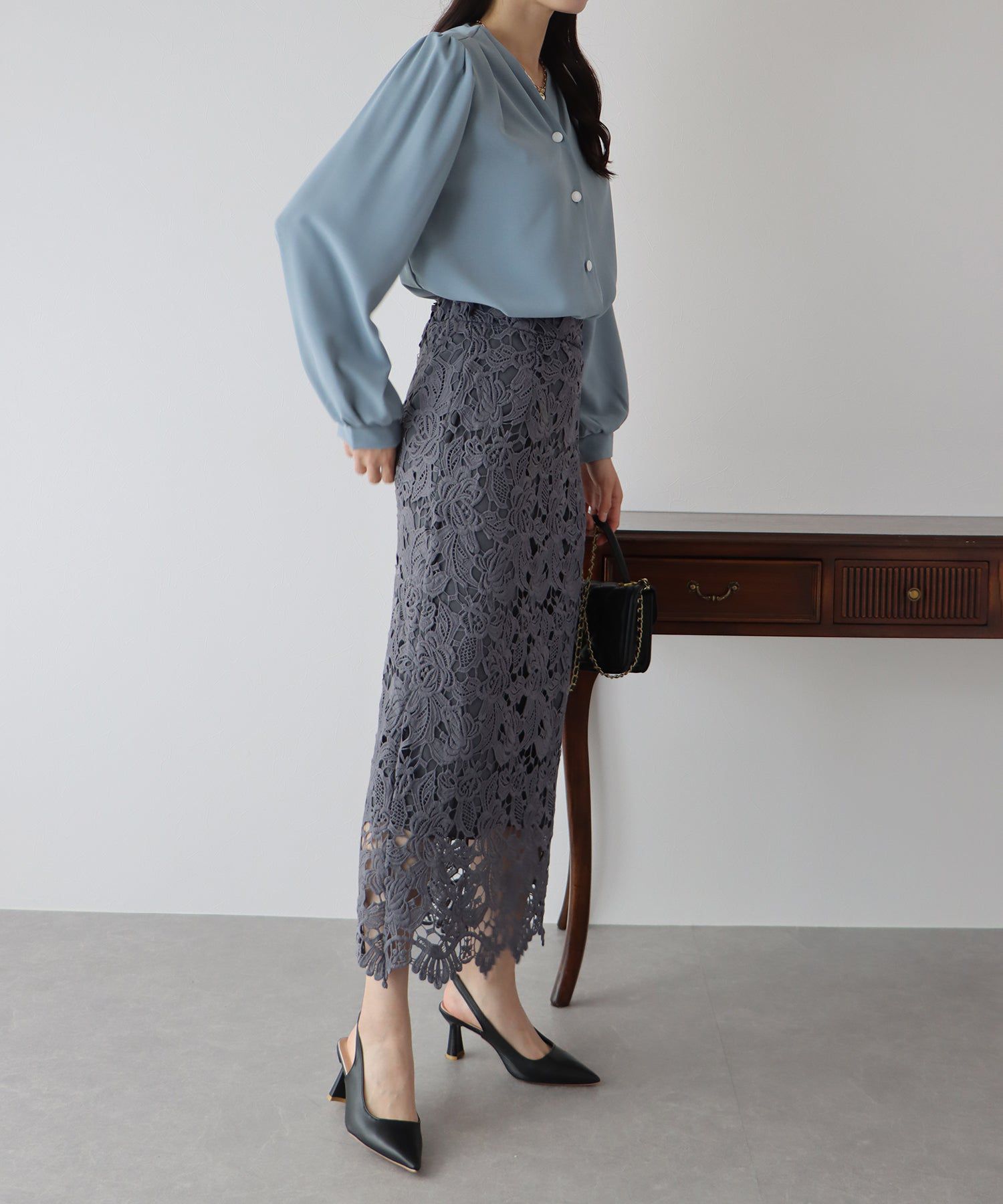 日本 BLUE EAST - 高雅蕾絲雕花鉛筆窄裙-灰黑
