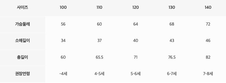 尺寸表由上而下為:尺寸、胸圍、袖長、總長、建議年齡