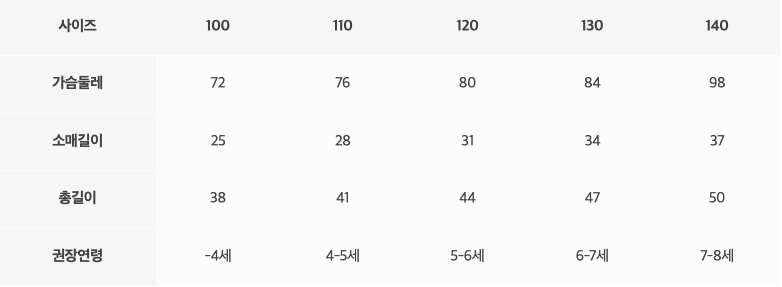 尺寸表由上而下為:尺寸、胸圍、袖長、總長、建議年齡
