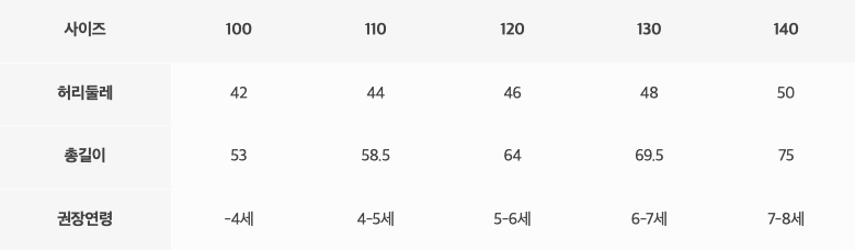 尺寸表由上而下為:尺寸、腰圍、總長、建議年齡