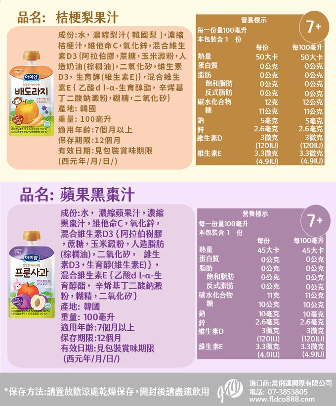 成分:水, 濃縮蘋果汁,濃縮黑棗汁,維他命C,氧化鋅,混合維 生素D3{阿拉樹膠,蔗糖,玉米澱粉,人造脂肪(棕櫚油),二 氧化矽, 維生素D3,生育醇(維生素E)},混合維生素E{乙酸 d l-α-生育醇酯, 辛烯基丁二酸鈉澱粉,糊精,二氧化矽}