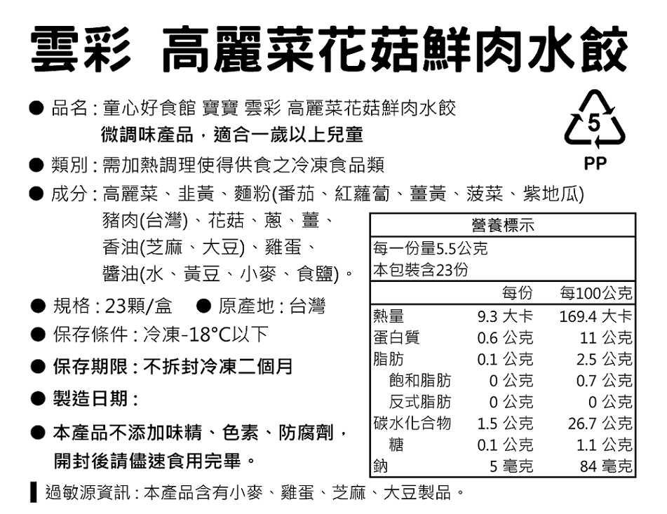 成分:寶寶 花花水餃-菠菜紅蘿蔔玉米豬肉 成分 : 麵粉(番茄、紅蘿蔔、薑黃、菠菜、紫地瓜)、菠菜、紅蘿蔔、玉米、雞蛋、豬肉(台灣)、香油(芝麻、大豆)、醬油(水、黃豆、小麥、食鹽)。 規格 : 39顆/盒 寶寶 雲彩 高麗菜花菇鮮肉水餃 成分 : 高麗菜、韭黃、麵粉(番茄、紅蘿蔔、薑黃、菠菜、紫地瓜)、豬肉(台灣)、花菇、蔥、薑、香油(芝麻、大豆)、雞蛋、醬油(水、黃豆、小麥、食鹽)。 規格 : 23顆/盒 寶寶 彩色餛飩-菠菜紅蘿蔔玉米豬肉 成分 : 麵粉(番茄、紅蘿蔔、薑黃、菠菜、紫地瓜、小麥)、菠菜、紅蘿蔔、玉米、雞蛋、豬肉(台灣)、香油(芝麻、大豆)、醬油(水、黃豆、小麥、食鹽)。 規格 : 28顆/盒