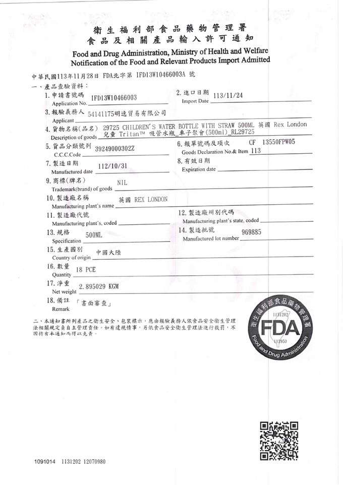🌺 通過台灣衛生福利部食品藥物管理署輸入許可
