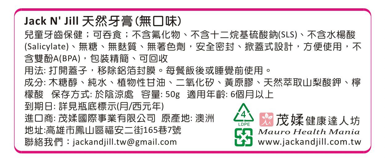 JACK'N JILlL牙膏主打100%純天然成分,富含木醣醇,且不含氟化物、無糖、不含三氯沙 (triclosan)、無添加防腐劑及發泡劑、不含有毒物質。給小朋友用感覺特別安心呢^^