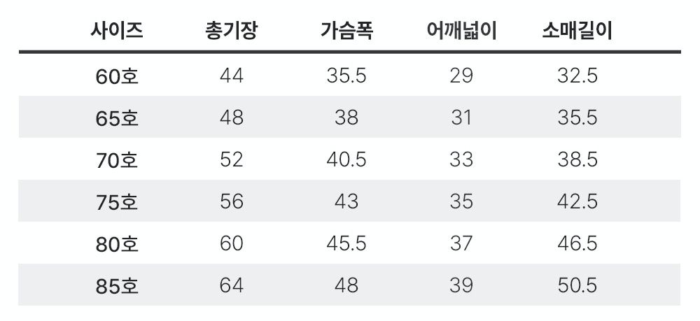 上衣尺寸表由左而右為:尺寸、衣長、胸寬、肩寬、袖長