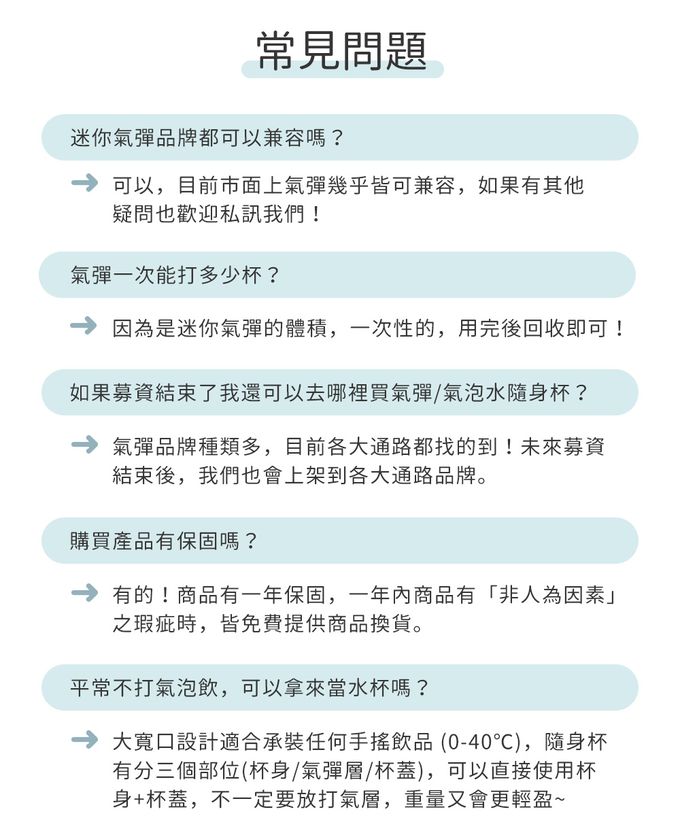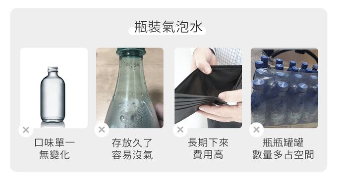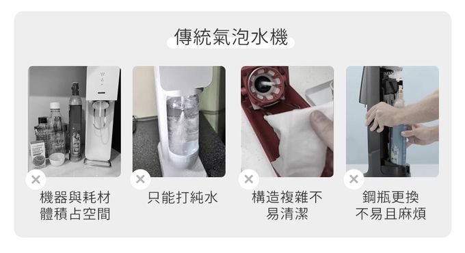 不過你有想過嗎?大部分的氣泡水機都只能在家使用,如果在外面想喝氣泡水該怎麼辦?傳統的氣泡水機,體積大、重量重,只是想喝一杯氣泡水,卻要花一大筆費用買機器和鋼瓶,且又沒辦法外出使用。而如果是買便利商店的瓶裝氣泡水,昂貴又不環保。