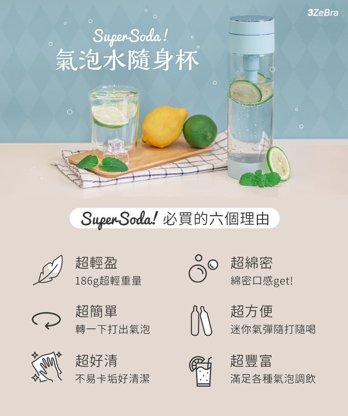 你的困擾我們都了解! 3ZeBra 團隊 2022 夏天最新商品「SuperSoda 氣泡水隨身杯」讓氣泡水機變成「可隨身攜帶」的隨手瓶!不但適合外出使用,操作起來也十分簡單。