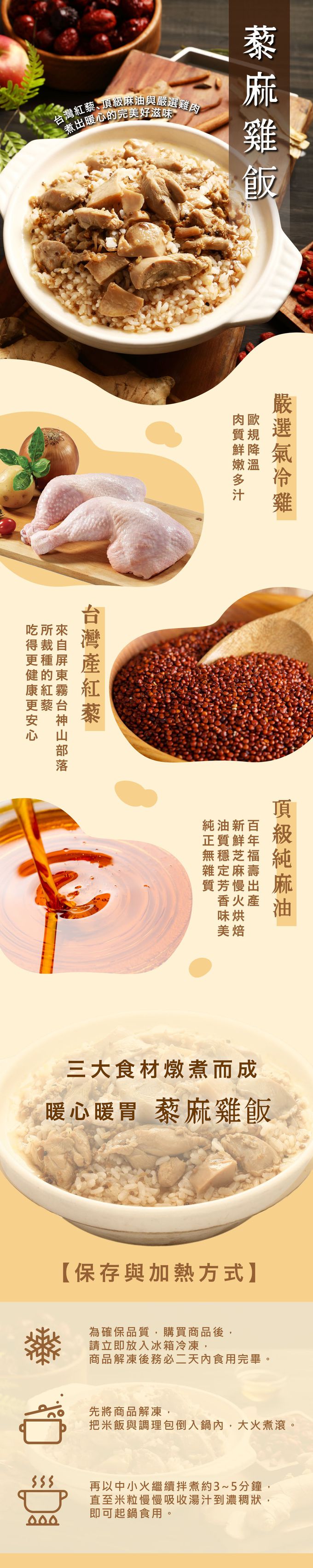 成分:水、白飯、雞肉、米酒、杏鮑菇、麻油、薑末、薑汁、紅藜、枸杞、食 鹽、調味料(食鹽、乳糖、檸檬酸鈉、胺基乙酸、DL-胺基丙酸、琥珀酸二鈉、 5'-次黃嘌呤核苷磷酸二鈉、5'-鳥嘌呤核苷磷酸二鈉、酵母抽出物、麥芽糊 精)、冰糖、素蠔油(水、蔗糖轉化液糖(蔗糖、水)、非基因改造黃豆(高蛋白 豆片)、小麥、食鹽、黏稠劑(玉米糖膠、乙醯化己二酸二澱粉)、酵母抽出物、香菇粉】