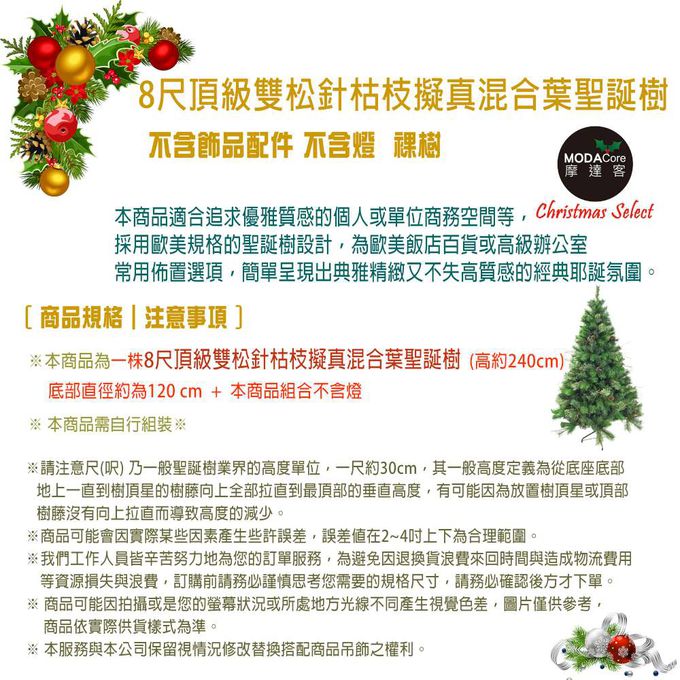 品名:摩達客★8呎/8尺(240cm)頂級雙松針枯枝擬真混合葉聖誕樹 裸樹(不含飾品不含燈)本島免運費
