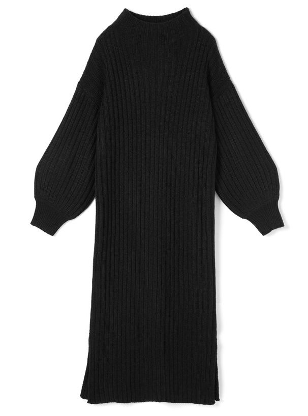 日本 GRL - 顯瘦羅紋氣球袖針織洋裝-簡約黑 (F)