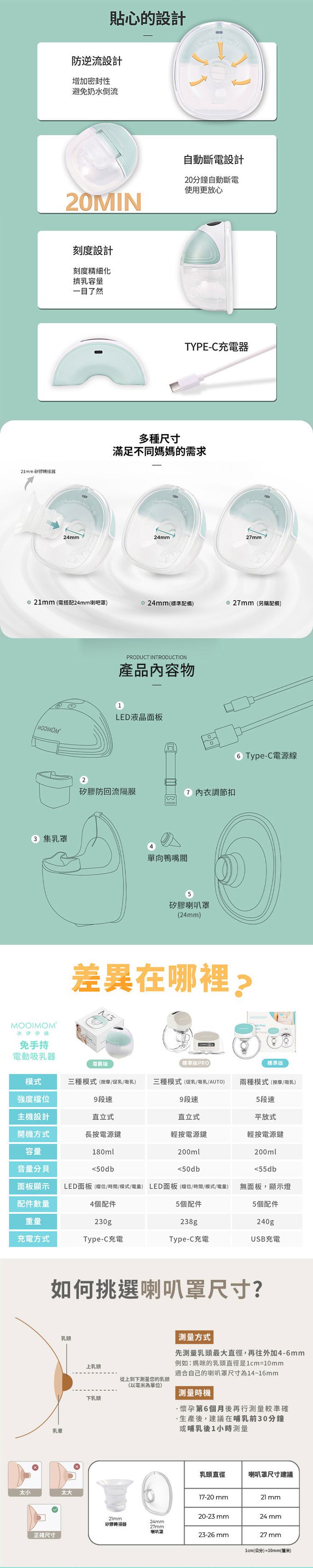 內容物:主機、Type-C電源線、矽膠喇叭罩24mm、單向鴨嘴閥x2、集乳罩、矽膠隔膜、內衣調節扣