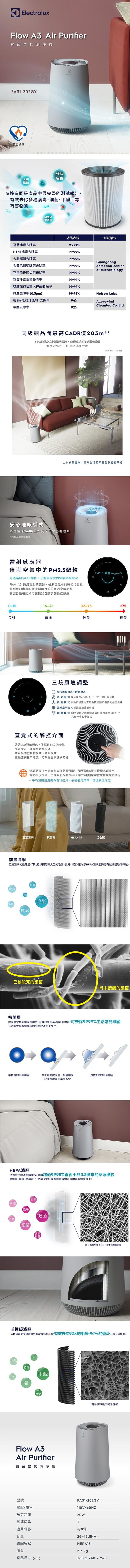 品名:Flow A3 抗菌空氣清淨機(沉思灰) 適用8坪空間 FA31-202GY